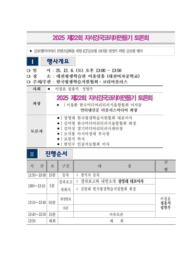 이에 앞서 식전행사인 2025 제22회 지식강국코리아만들기 토론회를 갖는다.